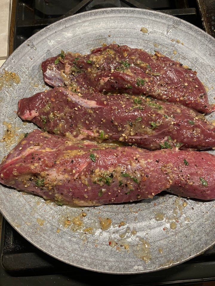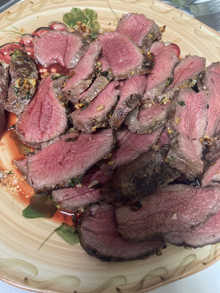 American Cookery might itself now qualify as “one of our older cookbooks,” through a certain lens. But in this case, how right its author was…extraordinary magnificence might actually be an understatement. It probably qualifies as my hypothetical last-meal-request, and it’s turned a lot of skeptical people on to the basic idea of wild game. Because of the head-count at the table this year, I added in one of the eye-of-round cuts from a hind leg—less tender, but still wonderful.
