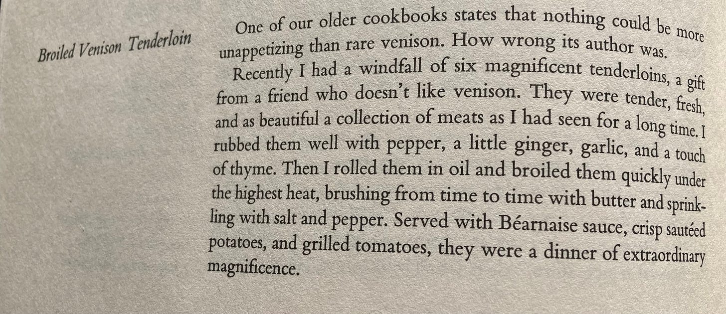 And in his case, a childhood in close proximity to the Western frontier, as well as the young adult’s deep-dive into classical French fare, left him perfectly situated to treat wild game not merely as a normal part of the larder, but an actual delicacy. It was exactly what I myself needed in that particular, pivotal moment.